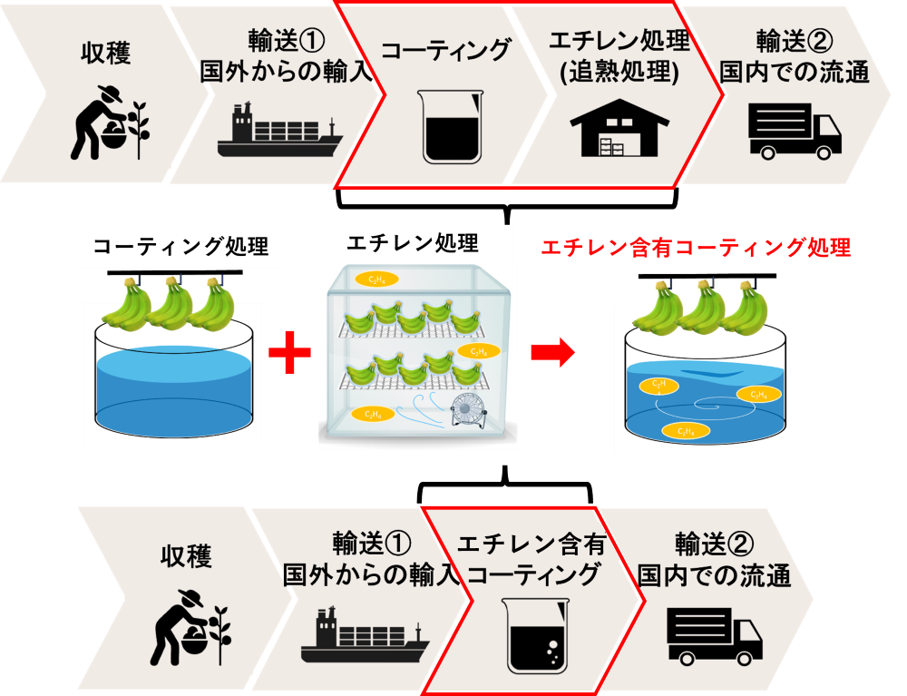 近年,青果物のフードロス削減は世界的課題となっており,日本国内においてもその重要性が高まっている。青果物は穀類や加工食品と比較して廃棄率が高く,収穫後も代謝活動を継続することや水分含量の高さ,外力に弱い構造が品質劣化を速める主因とされる(北澤,2023)。消費者が重視する品質要素には味,鮮度,外観,価格,安全性,産地などが挙げられ(農林水産統計,2019),特に外観と鮮度の保持は流通における廃棄削減に直結する重要な課題である。 バナナは日本で最も消費量の多い果実であるが,エチレンによる追熟処理後の品質劣化が速く,輸送や陳列時の衝撃による外傷がさらに劣化を加速させる。また脱プラスチックの流れにより従来のプラスチック包装の削減が求められ,新たな品質保持手法の開発が必要となっている。こうした背景から,可食性コーティングが環境負荷の低減と品質保持を両立できる技術として注目を集めている。 可食性コーティングは果実表面に薄膜を形成し,蒸散抑制・水分保持・内部品質の変化遅延などの効果を示すことが知られている(Thakur, 2018)。さらに外傷や乾燥による外観劣化の抑制,シュガースポットの出現抑制にも寄与し,青果物の品質保持に有望な技術である。しかし従来のコーティングはエチレン追熟処理とは別工程で行う必要があり,設備的負担や処理時間の増加が導入の障壁となってしまう。 そこで本研究では,追熟処理とコーティング処理を同時に行う新技術「エチレン含有コーティング処理」を開発した(Fig. 1)。本技術は,エチレンを含有させたアルギン酸ナトリウム溶液にバナナを浸漬し乾燥させるだけで,追熟促進と品質保持を同時に達成することを目的としている。この方法は燻蒸設備を必要とせず,短時間処理が可能である点で流通現場への適用性が高い。 通常のエチレン燻蒸処理との比較した結果,エチレン含有コーティング処理区は成熟進行がやや緩やかになるものの,最終的には燻蒸処理区と同等の成熟度に達し,十分な追熟効果を示した。また膜形成による外観保護効果が認められ,外傷や乾燥による劣化の抑制が期待できることが明らかとなった。 以上より,エチレン含有コーティング処理は,追熟と品質保持を同時に実現し得る簡便で省力的な技術であり,従来のエチレン燻蒸処理の代替あるいは補完技術として実用化が強く期待される。