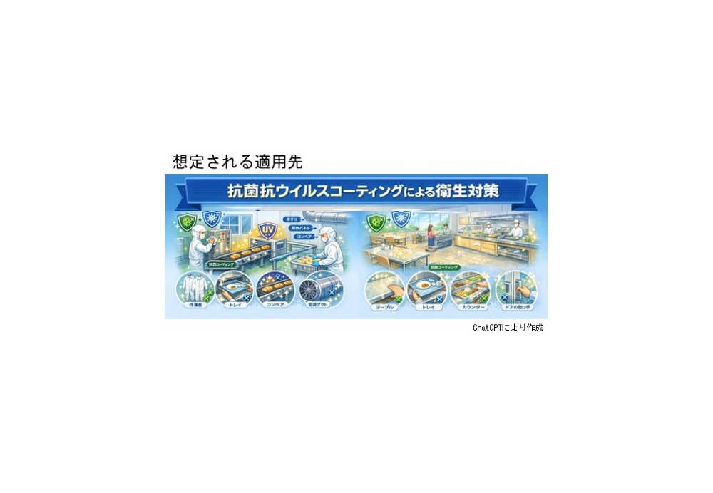 食品製造・加工・流通の現場では、設備や器具表面を介した微生物汚染を防ぐため、日常的に洗浄や消毒が行われている。しかし、消毒効果は時間とともに低下し、作業中の接触や環境由来の再汚染を完全に防ぐことは難しく、現場の負担増大や品質リスクの低減が課題となっている。このような課題に対し、本研究では消毒薬を一時的に使用するのではなく、表面に保持・固定することで効果を持続させる「消毒バリア」という新しい衛生管理の考え方に基づく2種類の抗菌・抗ウイルスコーティング技術を開発した。 これらのコーティングはいずれも、日常的な洗浄作業を補完する持続的な衛生管理技術として、食品製造ライン、作業台、搬送装置、包装設備、冷蔵・冷凍設備内部など、幅広い工程での活用が期待される(Fig.)。 本研究を導入することで、現場負担の軽減、品質リスクの低減、省力化につながることが想定される。現在、用途別の最適設計、量産プロセスへの適合、適用先に合わせた評価手法の確立など、企業との共同研究による発展を目指している。本発表・展示で食品業界の皆様と具体的な課題を共有し、将来の社会実装にむけての研究や実証試験を連携することを期待している。