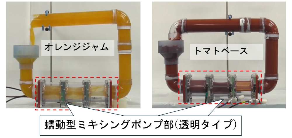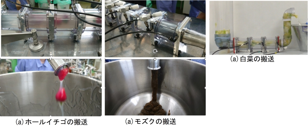 本研究では、固体と液体が混在する食品や高粘度食品を、破砕や詰まりを生じさせることなく「やさしく混合・発酵・搬送」できる新しい蠕動運動型ミキシングポンプを提案する。本装置は腸の蠕動運動に着想を得た柔軟チューブ構造を有し、チューブを周期的に収縮・弛緩させることで内容物を包み込むように押し出す。回転羽根やスクリューを用いないため低せん断であり、食品に強い力を与えず、形状や品質を保持したまま連続搬送できる点が特徴である。 本装置はポンプユニットを複数直列接続し、各ユニットを個別駆動することで、前後搬送、垂直揚重、混合・攪拌などの動作を自由に切り替えられる(Fig. 1,Fig. 2参照)。これにより「混合」と「搬送」を一体化し、従来のバッチ処理を連続プロセスへ置換できる。ジャムやトマト加工品、みそ、乳製品などの高粘度流体に加え、ホールイチゴ、白菜、モズク、茶葉などの軟質・絡みやすい固形物も破損なく安定搬送できた(Fig. 3,Fig. 4参照)。さらに、穏やかな揉み込み混合により菌の分散性が向上し、ヨーグルトや後発酵茶などの発酵工程の促進にも有効である。 本技術は、混合・搬送・発酵を一本の配管で連続処理できる新しい食品加工プラットフォームとして、省人化、省スペース化、洗浄負担の低減、品質安定化および製造コスト削減への貢献が期待される。