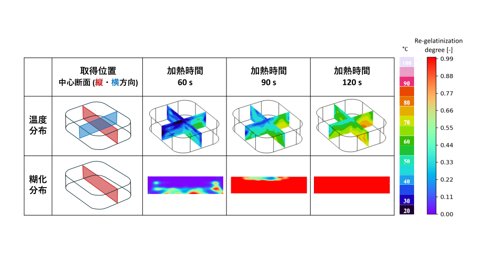 1.背景 マイクロ波加熱は、レトルト殺菌、ブランチング、乾燥、ベーキングなどのプロセスにおける高温空気や蒸気、温水といった熱媒体を使用した加熱に代わるものとして、産業プロセスへの適用がますます拡大しています。しかしながら、加熱の不均一性は依然としてマイクロ波技術の大きな欠点です。食品内の高温部と低温部の温度差は、微生物汚染や公衆衛生上の問題につながる可能性があります。近年、この限界を克服するために、固体マイクロ波デバイス、マルチマグネトロンマイクロ波システムそして、ハイブリッド加熱技術の開発がすすんでいます。これらの新しいマイクロ波加熱技術は、処理時間とエネルギー消費を大幅に削減することを可能にします。しかしながら、その効果を最大限に引き出すには、装置内部の設計とプロセスパラメータの最適化が不可欠です。予測モデリングはこの最適化において、新しい食品やその包装の設計における試行錯誤を回避し、コスト削減と競争力向上に貢献します。さらに、これらの技術は、栄養価やおいしさ、微生物学的安全性にそれぞれ異なる影響をもたらします。消費者に安全で魅力的な食品を提供するため、本研究では、予測モデルを活用して最先端のマイクロ波加熱技術を最適化し、加熱効率と均一性の向上を実現させることを目指します。 2. 方法 当研究室では、有限要素法をはじめとする解析手法を活用し、熱・物質移動、流体力学、電磁気学、化学反応といった多様な物理モデルを統合することで、新たな加熱技術下における伝熱特性と食品内部の物性変化を解析し、産業プロセスの最適化に資する予測モデリングを実施しています。 ここでは、通常のフラットテーブル型電子レンジ、マルチマグネトロンシステム、さらにハイブリッド加熱システムを対象に、有限要素解析ソフトCOMSOL Multiphysics 6.4を用いて、3次元要素モデルを作成し、電磁界と熱伝導の連成解析を実施します。この結果に基づき、対象食品に応じた要因、例えば澱粉の糊化やタンパク質の変性、色調、食感といった品質パラメータと関連付けて評価します。 3.結果がもたらす社会的意義 新しいマイクロ波加熱システムのコンピュータシミュレーションモデルを確立することで、処理パラメータの微調整や最適化、さらに処理された食品の最適条件を高精度に予測できます(図1)。これにより、エネルギー消費の削減や廃棄物の削減が期待でき、費用や時間のかかる実験的試行錯誤を最小化できます。 これらの成果は、この分野のグローバルな発展を促進するとともに、地域の食品セクターをより競争力が高く、持続可能な産業へと変革することへ貢献すると期待されています。