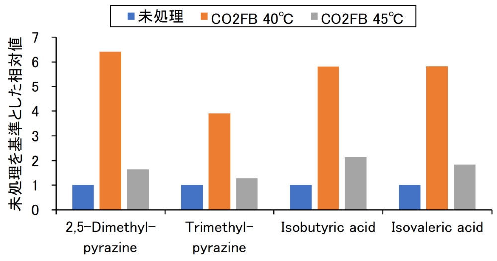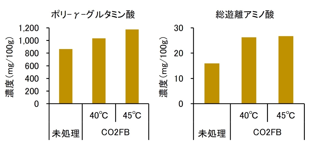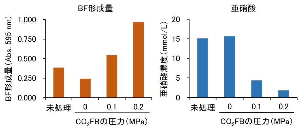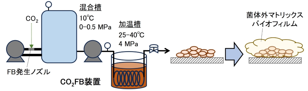 【研究背景】 これまで、二酸化炭素ファインバブル(CO2FB)による食品の殺菌・酵素失活に関する研究を行い、清酒の製造方法として実用化を果たした。さらに、その殺菌メカニズムの研究を行う中で、CO2FBにより微生物の膜酵素が活性化することおよび細胞膜疎水性度が高まることを明らかにした。そのため、CO2FBで死滅しない程度に処理した微生物は、菌体外マトリックスの生産量を増加させ、それに伴い有用なバイオフィルム(BF)形成を促進することを見出した(図1)。 【実験結果】 加温槽の温度40および45℃でCO2FB処理した納豆菌を用いて作成した納豆は、粘りの主要成分であるポリ-γ-グルタミン酸量(PGA)および遊離アミノ酸量が増加し、40℃で香気成分量が増加した(図2、3)。よって、CO2FBは納豆菌の菌体外マトリックスであるPGAを増加させる能力および発酵力を高めた。加温槽の温度25-35℃および混合槽の圧力0.2-0.4 MPaでCO2FB処理したヨーグルトスターター用の乳酸菌を用いて作成したヨーグルトは、菌体外多糖(EPS)量が増加した。加えて、混合槽の圧力0.2-0.3 MPaでCO2FB処理したナタ菌は、バイオセルロース(BC)形成量を促進した。よって、CO2FBは、乳酸菌およびナタ菌の菌体外マトリックスの生産能力を高めた。混合槽の圧力0.1および0.2 MPaでCO2FB処理した脱窒素細菌はBF形成を促進し、そのBFはより効率よく亜硝酸を分解した(図4)。すなわちCO2FBは有用なBF形成を促進した。 【今後の展開】 今後については、CO2FBにより活性を高められる有用微生物種をさらに探索し、効率的な発酵食品の製造を可能にする。さらに、CO2FBにより環境浄化に関わる微生物の活性を高めた排水処理システムを構築する。