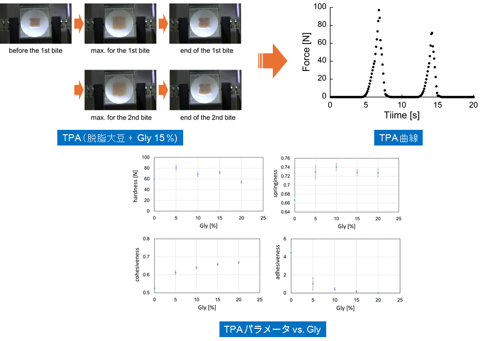 研究発表者はこれまでエクストルージョンクッキング技術を活用することで, 農産物の利活用向上や多様な消費者ニーズに対応した新規素材の開発可能性について報告してきた。これらの技術を用いて組織状食品素材を作製する際, 一般的には脱脂大豆や分離大豆タンパク質などの生体高分子素材を原材料として用いるが, 押出物の形状が不安定になるなど様々な問題があった。前回はこれらを改善するために可塑剤としてグリセリンを5%w/w添加したとき, 押出物が安定的に供給されること, 素材のテクスチャーがグリセリンによって変化することを報告した。さらに、グリセリンを通常の可塑剤添加量である5%w/w程度からさらに増加して添加した場合に、今までの実験条件におけるエクストルーダーの運転条件では困難であった脱脂大豆のみで組織状素材を作製できることを見出した。 今回の研究紹介では, 脱脂大豆にグリセリンを添加することで得られた新規の組織状素材についてその開発過程と, 得られた組織状素材試料に対しての機器測定によるテクスチャー評価の結果について報告する。その結果, 20%w/wまで添加されたグリセリンは脱脂大豆たんぱくを主骨格とする繊維状の組織の構造を変化させ, 様々な物性の変化を及ぼしている傾向が認められた。エクストルーダー製造される素材は様々なタンパク質素材を含めて, その栄養性や物性などを, 多様な消費者の食嗜好に合わせて設計する必要性がある。そのような食品のベースとなる素材として, 今回我々が開発した素材は広く移用される可能性がある。たとえばタンパク質を添加することによる高タンパク含有の食品開発や, 低コストである点を活用していわゆる「つまみ」の基材となりうるなど幅広い活用が考えられている。さらにグリセリンを添加する効果についてより詳細に検討するため, グリセリンをプロピレングリコールやソルビトールに代えて組織状素材を作製し, そのテクスチャーについても解析を行った。これについても本発表で報告する。