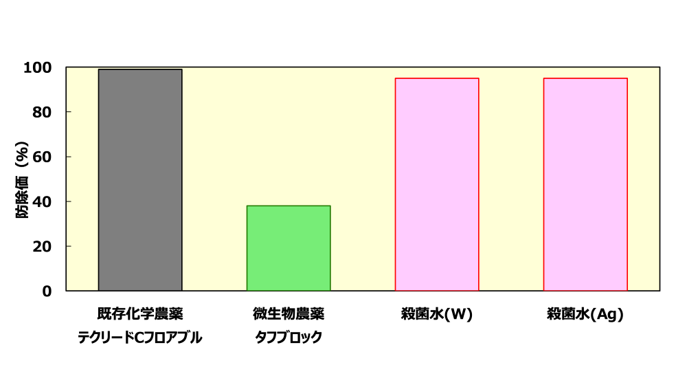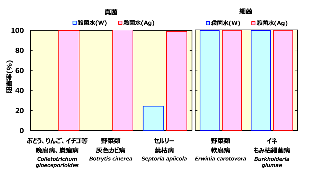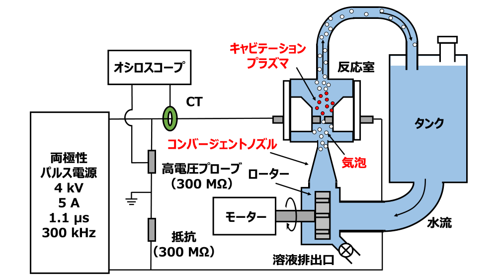 【研究テーマ】 キャビテーションプラズマ殺菌水による「脱・化学農薬」型病害防除技術の開発 【背景とねらい】 ・2050年の世界の食糧需要は2010年比約1.7倍と予測され、化学農薬の使用量も同程度に増加すると見込まれている。 ・一方で、EU「Farm to Fork」や日本の「みどりの食料システム戦略」では、農薬リスク・使用量の大幅削減が国際目標として掲げられている。 ・本研究では、水のみを原料とするキャビテーションバブルプラズマ(CBP)技術により、化学農薬に代わる農業用殺菌水の創出を目指す。 【技術の特徴】 ・減圧沸騰で生成した水蒸気微小気泡中に高電圧パルスを印加し、気泡内に低温プラズマを発生させる。 気泡中での電界集中により、通常放電の100倍以上の処理効率で活性種を生成することができる(図1)。 ・主成分は水(約99.9%)で、過酸化水素(約0.1%)とAg・Cuなど金属ナノ粒子/イオン(数10 ppm)を含み、「活性酸素タイプ」と「金属イオンタイプ」を使い分けることができる。 ・ラット急性経口毒性試験でLD₅₀>5000 mg/kg、Ames試験陰性と高い安全性が確認されている。 【抗菌性能と安定性】 ・植物病原菌5種(真菌3、細菌2)を対象とした阻害率試験で、金属イオンタイプCBP水は全菌種に対してほぼ完全な生育阻害を示すことができる(図2)。 ・活性酸素タイプは細菌に対して高い阻害率(98%以上)を示す一方、真菌に対しては効果が限定的である。 ・金属イオンタイプは製造後5か月保存しても阻害率98%以上を維持し、長期保存が可能であることが確認されている(図3)。 【防除試験と適用場面】 ・イネ腐敗症の種子消毒では、CBP殺菌水が既存化学農薬と同等、微生物農薬以上の防除効果を示し、水交換が不要であるため作業時間と廃液量の低減が期待される(図4)。 ・イネ葉いもち病の葉面散布では、展着剤を添加することで化学農薬と同等の病斑抑制効果を達成することができる。 ・一方、イネ紋枯病など土壌伝染性病害に対する効果は限定的であり、他技術との組み合わせが今後の課題である。 【今後の展開】 ・圃場スケールでの長期連用試験、多様な作物・病害への展開、植物工場・養液栽培・畜産・ポストハーベスト等への応用実証を進める予定である。 ・CBP殺菌水の高速生成・高濃度化を図り、「化学農薬の代替技術」として持続可能な農業システムへの実装を目指す予定である。
