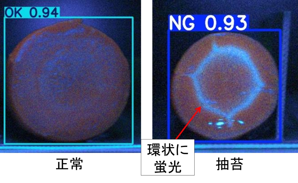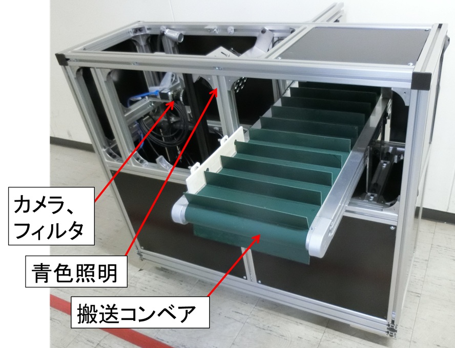<背景> 人参の加工現場では、内部の木質化(以下、抽苔)の有無を全数人手で検査している。しかし、人手不足や労働生産性の低下が課題となっており、抽苔を高速かつ高精度に判別可能な装置の早期開発が求められている。 <目的> AIと青色光を用い、高精度かつ高速、非破壊で抽苔の有無を判別可能な装置を開発する。 <類似研究との比較> 抽苔人参の発生を抑制するための品種改良に関する研究は数多く報告されている。一方、抽苔を非破壊かつ高精度に検査する手法の開発例はほとんどない。 また、人参切断時の反力を計測することで抽苔を判別する手法は実用化されているが、抽苔の判別精度は十分ではなく、課題が残されている。 <研究の結果> 人参のヘタを除去した切断面に青色光を照射して撮影した画像をAIで解析し、抽苔の有無を判別可能な装置を開発した(図1)。次に開発した装置で正常人参および抽苔人参を撮影し、判別した結果の一例を図2に示す。抽苔を含む人参サンプルを47本供試して評価したところ、抽苔判別精度は97.4%に達し、抽苔人参を正常人参と誤判別する事例は確認されなかった。 高精度な抽苔判別が可能となった要因として、抽苔部分と正常部分における成分の違いにより、青色光照射下で蛍光特性に明確な差が生じたことが挙げられる。開発したAIでは、この特性の差を利用して判別していると考えられる。また、開発したAIを用いて、リアルタイムで抽苔人参を判別できることを確認した。 <食品機械業界で想定される用途> 従来の装置では抽苔を完全に判別できず、人手に依存していた検査工程に本技術を適用することにより工程を自動化できる点に特徴がある。これにより、抽苔混入を高精度に検出することによる製品品質の向上と、作業の効率化・省力化を同時に実現し、食品加工現場における品質管理の高度化に貢献する。