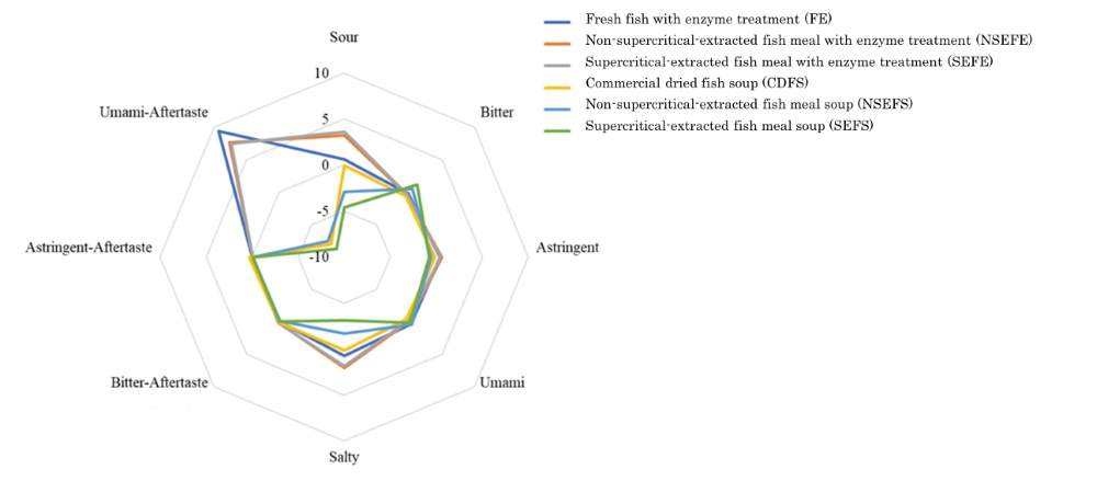 【研究背景:低利用水産資源のアップサイクル】 台湾・澎湖海域で多獲される「小鱗脂眼鯡(Etrumeus micropus、イワシの一種)」は、DHAやEPAなどのオメガ3脂肪酸を豊富に含みながらも、加工利用が難しいため、従来は飼料や魚粉などの低価格な用途に限られていた。本研究では、この未利用資源に先端加工技術(超臨界二酸化炭素抽出および酵素加水分解)を適用することで、高機能な魚油と風味豊かな調味素材へ加工する利用モデルを構築した。 【技術1:超臨界CO2による高品質魚油の抽出】 安全性が高い「超臨界二酸化炭素抽出技術」を用い、魚粉から機能性成分を効率的に回収するプロセスを最適化した。 • 抽出条件の確立: 圧力400 bar、温度60°C、抽出時間120分の条件下において、未篩別の魚粉を用いることで最も高い抽出効率と回収率を達成した。なお、二酸化炭素の流速による有意な影響は認められなかった。 • 高品質な成分: 抽出された魚油には6.6%のEPAおよび15.2%のDHAが含まれており、機能性魚油としての高い潜在性が示された。 【技術2:抽出残渣の酵素分解による旨味素材化】 魚油抽出後の残渣(脱脂魚粉)を廃棄せず、酵素加水分解することでタンパク質の低分子化を促進し、付加価値の高い調味ベースを開発した。 • 旨味の増強: 酵素処理により、アスパラギン酸やグルタミン酸などの旨味アミノ酸、およびグリシンやアラニンなどの甘味アミノ酸が顕著に増加した。 • 風味特性: 保持された核酸系旨味成分であるイノシン酸(IMP、96〜103 mg/kg)と遊離アミノ酸との相乗効果により、官能評価および味覚センサー分析において、強い旨味と持続性のあるコク(旨味の後味)が確認された。 【産業的展望:経済性とSDGsへの貢献】 プロセスシミュレーション(SuperPro Designer)による経済性評価の結果、本プロセスは設備依存型の高資本集約型モデルであることが判明した。 • 収益性と課題: 原料供給が安定している条件下では十分な収益性と約5年での投資回収が見込まれる一方、供給変動が単位コストに大きく影響するリスクも明らかとなった。 • サステナビリティ: 本技術は、小鱗脂眼鯡から機能性魚油と調味素材を同時に製造するものであり、水産廃棄物の削減と資源の高度利用を両立するフードテックソリューションとして期待される。