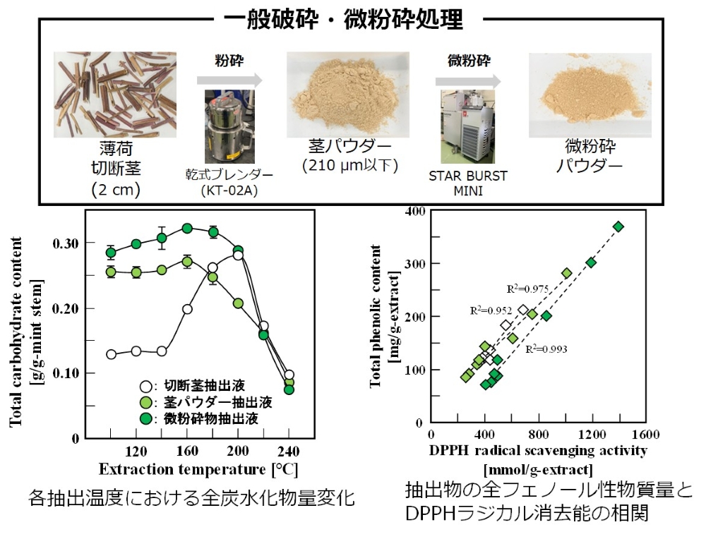 本研究では、湿式微粉砕および環境調和型抽出技術を基盤とし、農業副産物を含む植物由来資源の高付加価値化と新規食品素材の創出を目的としている。農業副産物である植物の皮、茎および種子などには有用成分が豊富に含まれているが、その多くは十分に活用されていない。従来の有機溶媒を用いた抽出法は毒性や環境負荷の課題を有するため、本研究では環境負荷の低い亜臨界水抽出に着目した。薄荷の茎を対象に、粉砕条件が抽出効率に及ぼす影響を検討した結果、微粉砕による粒子サイズの微細化が抽出効率を大きく向上させることを明らかにし、有用成分を効率的に回収する技術を確立した。 さらに、植物タンパク質食品である湯葉の製造において、熱風処理により液面における疎水性相互作用を促進することで、成膜時間の短縮および品質の安定化を実現した。また、豆乳製造副産物であるオカラを微粉砕して添加することで、成膜阻害の改善とともに食物繊維の付加による機能性向上を達成した。これにより、未利用副産物の有効利用と食品機能性の向上を両立することが可能となった。 加えて、湿式微粉砕により得られるセルロースナノファイバー(CNF)は、高い保水性や増粘性を有する新規食品素材として注目されているが、乾燥後の再分散性低下が課題である。本研究では、有機溶媒や化学修飾を用いずにCNFを作製し、食品添加物を利用した複合化技術を開発することで、乾燥後も優れた再分散性を示すCNF複合材料の開発に成功した。 これらの成果は、微粉砕技術を基盤とした物理的プロセスにより、環境負荷を低減しながら植物資源の機能性を最大限に活用するものであり、持続可能な食品素材開発および食品産業への応用展開に貢献することが期待される。