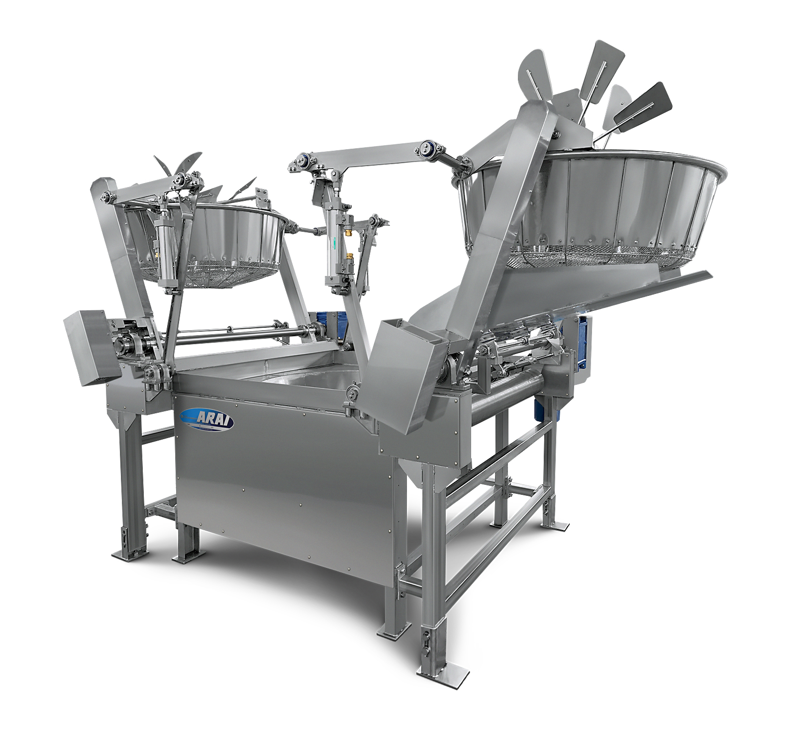 一般のフライヤーはナベとカゴが1組に対し、2in1フライヤーはカゴを2基にして交互運転をすることで生産量が大幅にアップします。