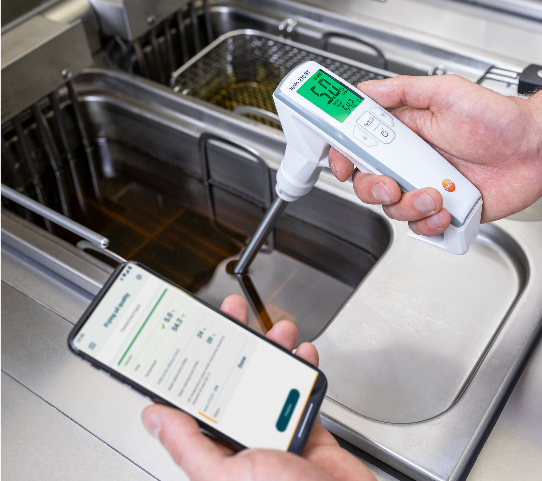 食用油の品質が良好であるかどうかを確認するには、目視や臭気チェックだけでは不十分です。また試験紙では測定値が数値で確認できません。店舗スタッフは、食用油テスター testo 270 BT で測定したTPM値が上限に達した場合、フライ油を交換するという運用フローとなり、フライ油の交換基準のばらつきが少なくなります。不必要に頻繁なフライ油の交換 (=コスト削減) を減らし、常に高い品質を保つことができます。モバイルアプリ testo Smart の接続により、測定値のデジタル化ができ、ペーパーレスも実現可能です。