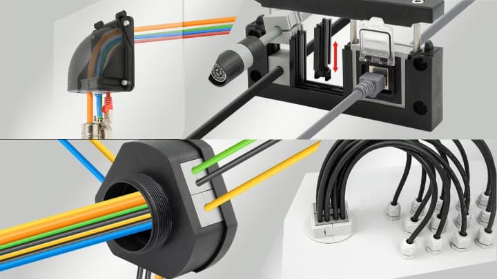 コネクタや丸端子が結線されたケーブルは革新的な分割形ケーブルグランドで素早く作業が完了できます。ケーブル径と同じスリット式グロメットを選定、約80種類から最適なフレームを選び、そこへブロックのように滑り込ますだけの組みたて方法です。