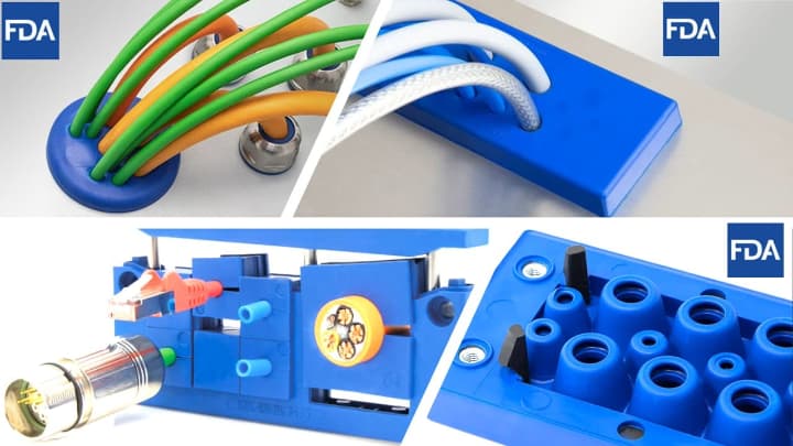 青色分割形ケーブルグランド&FDA認証 集約型ケーブルグランド。クリーンルーム クラス1認証 ケーブルエントリーシステム