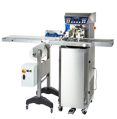FOOMA初出品の卓上型エンローバーを発表!本ブースでは焼き菓子をコーティングするデモンストレーションを実施。