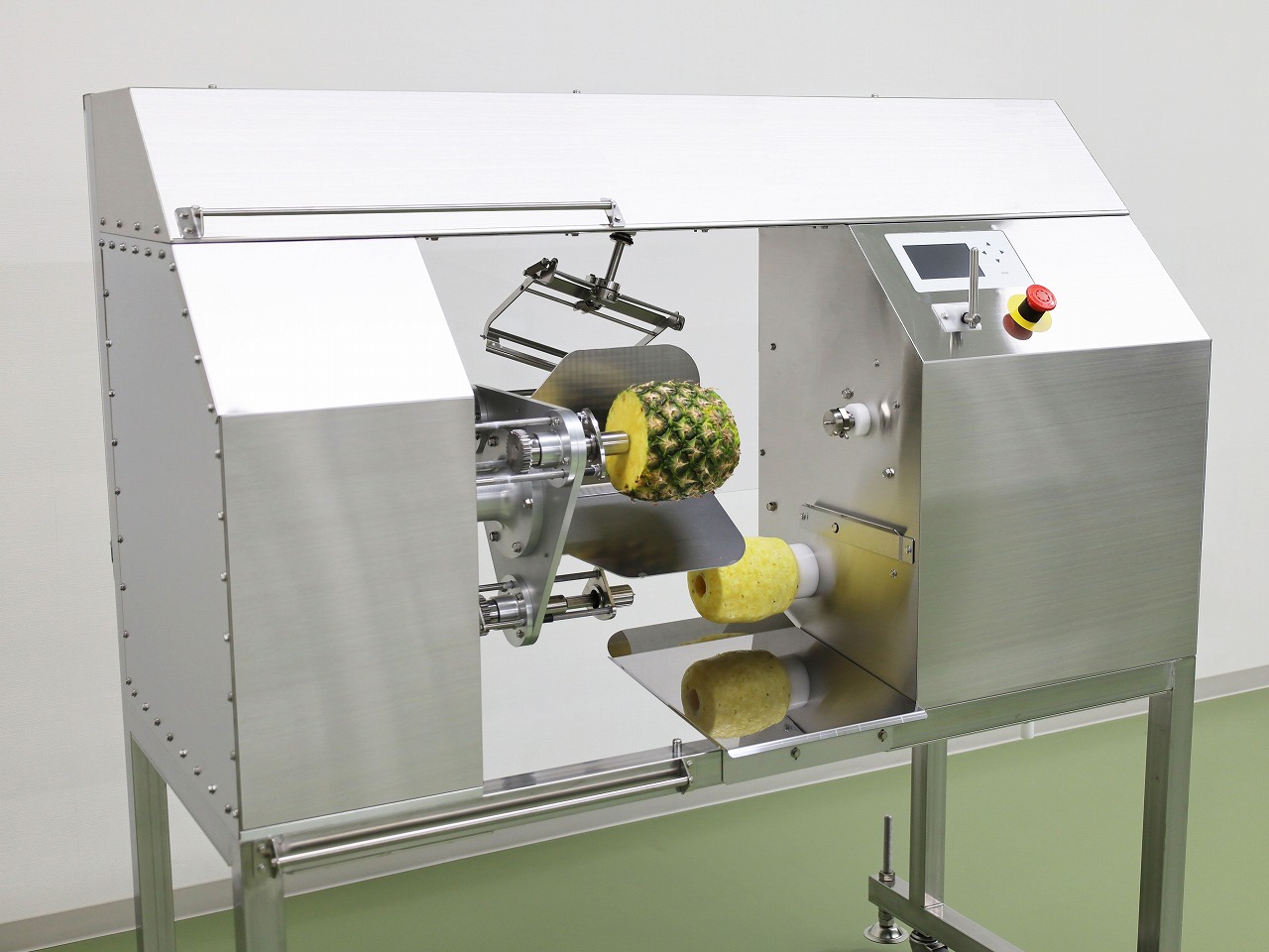 パイナップルの挿入から皮むき、芯抜き、排出までの一連の工程をすべて自動で行える革新的な皮むき機