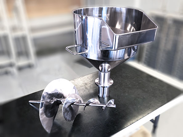 こちらは、食品製造工場にて用いられる、投入したパン生地を押し出すためのスクリューを備えたステンレスタンクです。