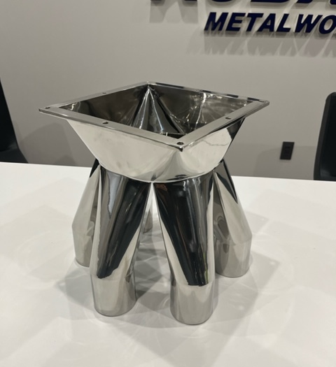 このホッパーの六つの排出口は、次工程へ素材を入れる際に、それぞれ均等な寸法が必要なため、作製には非常に高い精度が求められます。